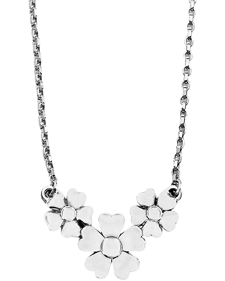 - A trio of flowers sparkles and shines on this sweet and feminine short silver necklace, perfect for spring through summer!