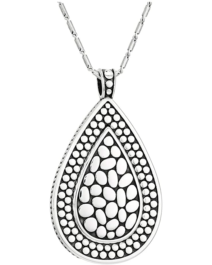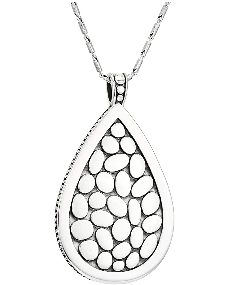 - This reversible teardrop pendant features an organic-shaped pebble motif on one side, while the reverse imitates the regular cadence of Balinese style dots framing the organic motif.